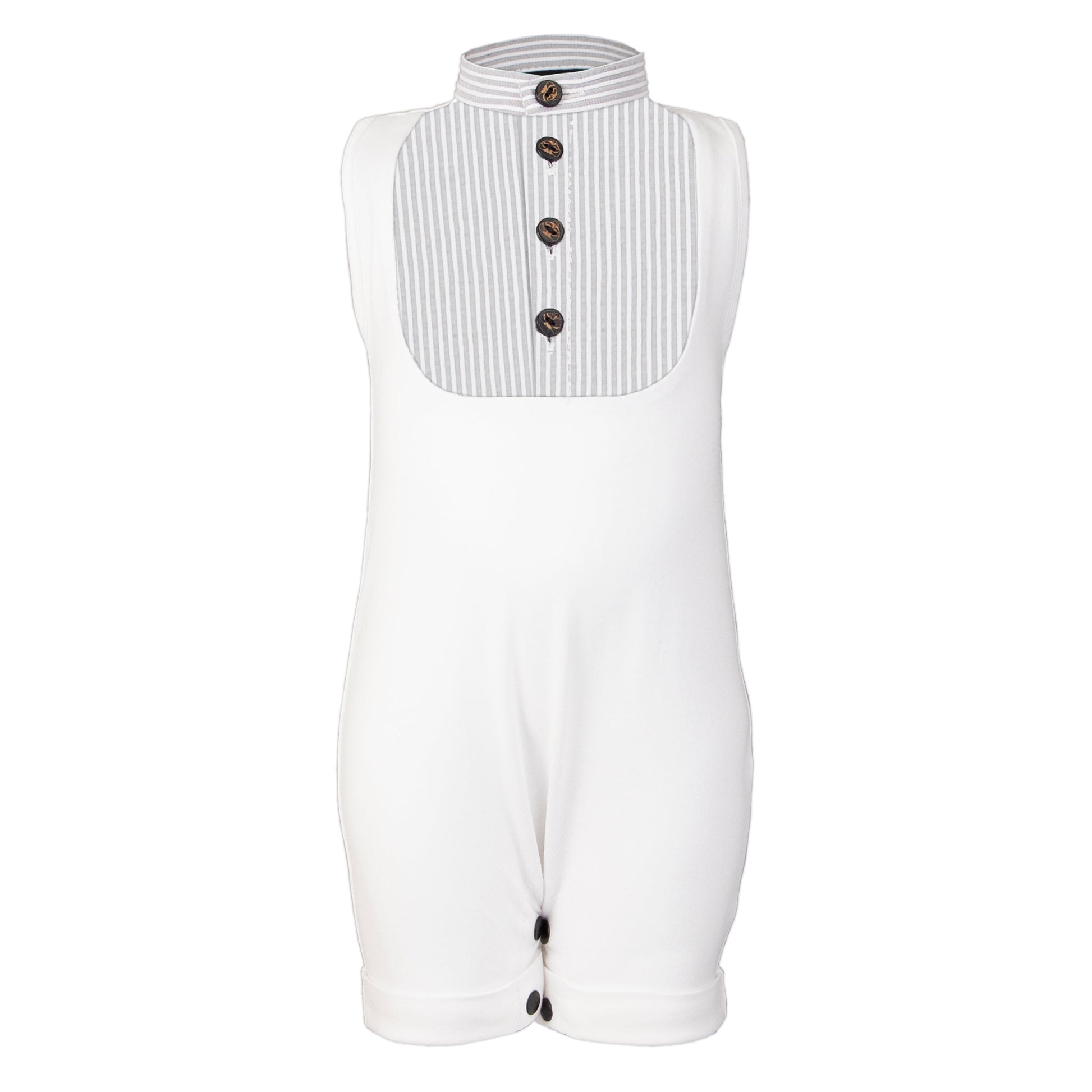 Luxurious Fabric: Made from 100% Organic Jersey Cotton, this playsuit features a light, strong, and naturally soft fabric that ensures maximum comfort. The detail in white and grey organic thin striped cotton adds an extra touch of elegance, making it perfect for sensitive baby skin.